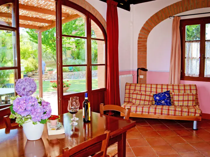 Obnovljeno seosko imanje nalazi se na panoramskoj poziciji okruženo sopstvenim vinogradima i maslinicima. 6 km od centra mesta San Gimignano, mirno, sunčano mesto na brežuljku, u zelenom. Za zajedničko korišćenje: imanje 2 ha, velika, lepa, negovana bašta sa biljkama, travnjak za sunčanje, bazen (6 x 12 m, dubina 110 – 150 cm, sezonska dostupnost: 17.apr. – 09.okt.) . Spoljni tuš, stoni tenis, terasa, baštenska garnitura, roštilj, dečije igralište (tobogan, ljuljaška). Za samostalno korištenje: mali vrt sa travnjakom i cvećem. U kompleksu: sala za doručak, pristup internetu, mašina za veš (za zajedničku upotrebu, uz doplatu), grejanje se plaća na licu mesta, grejanje dostupno samo od 01.11. – 15.Apr.. Parking. Trgovina 4 km, supermarket 4 km, restoran 3 km, železnička stanica „Certaldo“ 5 km, peščana plaža „Pisa“ 65 km, natkriveni bazen 4 km. Golf teren 25 km, tenis 8 km, jahanje konja 5 km. Obližnje atrakcije: Siena 40 km, Firenze 50 km. Lokalna prodaja poljoprivrednih proizvoda. Napomena: vlasnik živi na istom imanju.